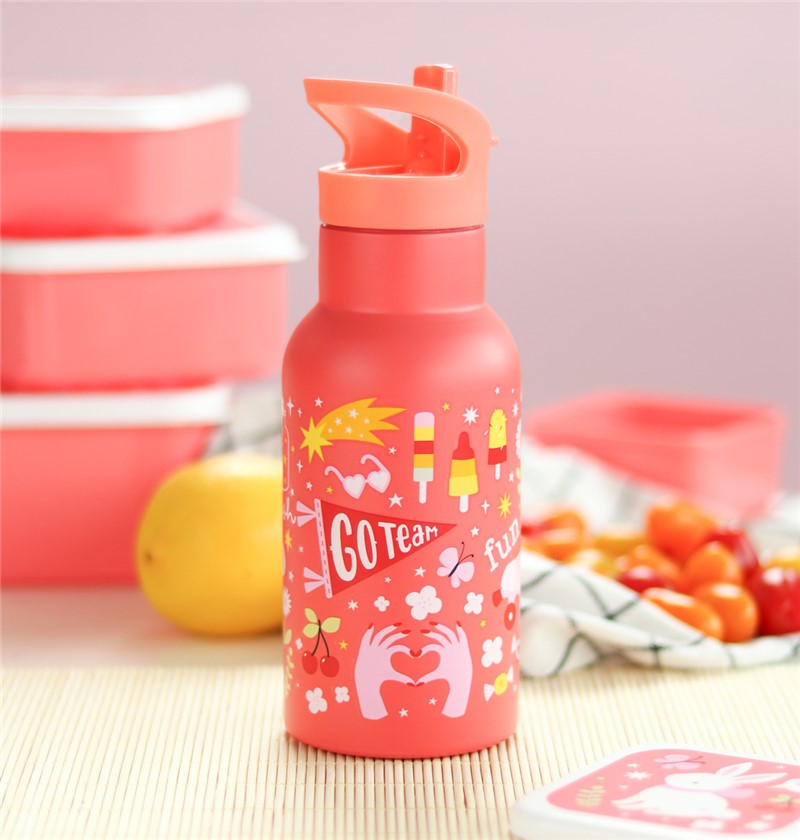 La botella de acero inoxidable es ideal para llevar al colegio. Esta botella infantil tiene doble pared, lo que mantiene las bebidas frescas. La botella de 350 ml incluye de serie un tapón de rosca, boquilla y pajita para bebidas frías. El tapón de rosca de acero inoxidable para bebidas calientes está disponible por separado.